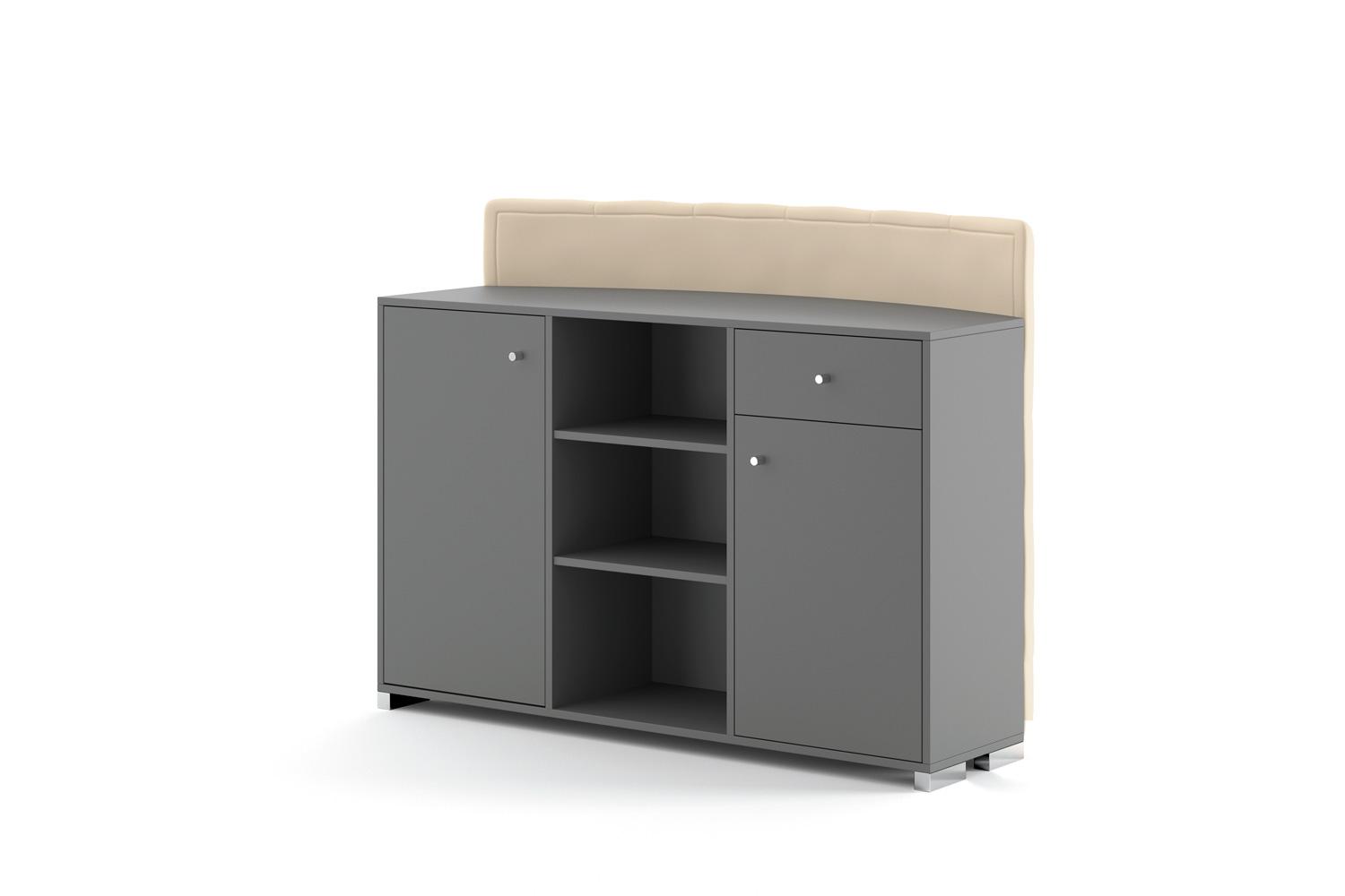 Disponible en ocho acabados de melamina para la estructura, permite adaptar su base a distintos estilos decorativos, creando combinaciones equilibradas entre modernidad y calidez. El panel frontal puede personalizarse con una amplia gama de veinticuatro tapizados, ofreciendo múltiples posibilidades para integrarse en la identidad visual del negocio.